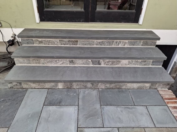 Natural stone makes this lead walk unique, sharp looking and environmentally friendly. The old cracked and worn concrete was removed and replaced with a permeable gravel base, large slabs of lilac and blue cleft flagstone and decorative gravel to make a modern walk with style and functionally that will reduce water run off and keep rain water on the property for the landscape plants.